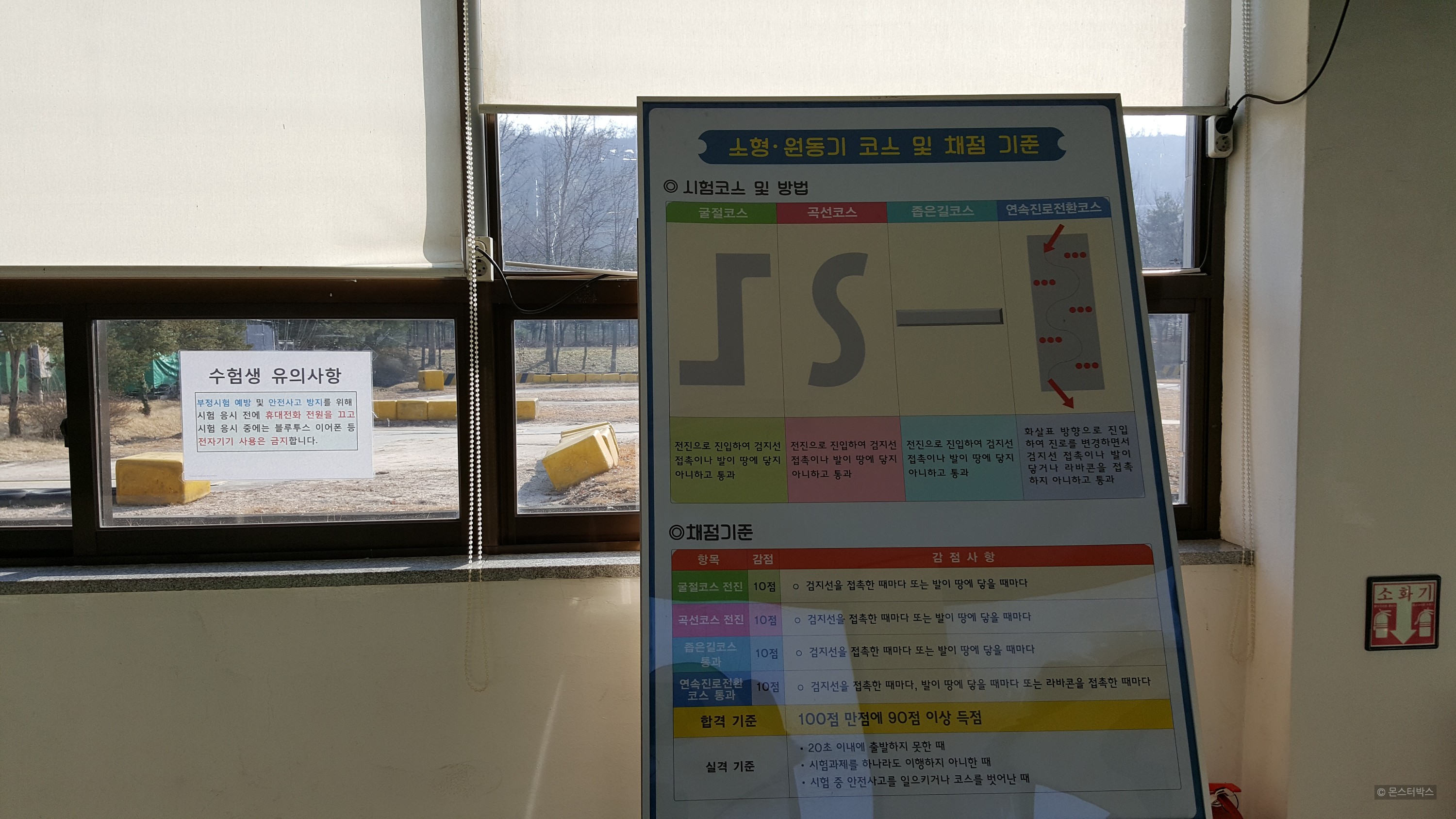 이곳 시험장은 이렇게 생겼습니다. 이곳은 시작지점에 여유가 있어 급출발을 해도 브레이크 잡을 여유가 있어서 그나마 여기가 나은듯 합니다. 일단 확실히 강서보단 넓습니다. 대기실도 꽤 여유가 있는 편입니다.
