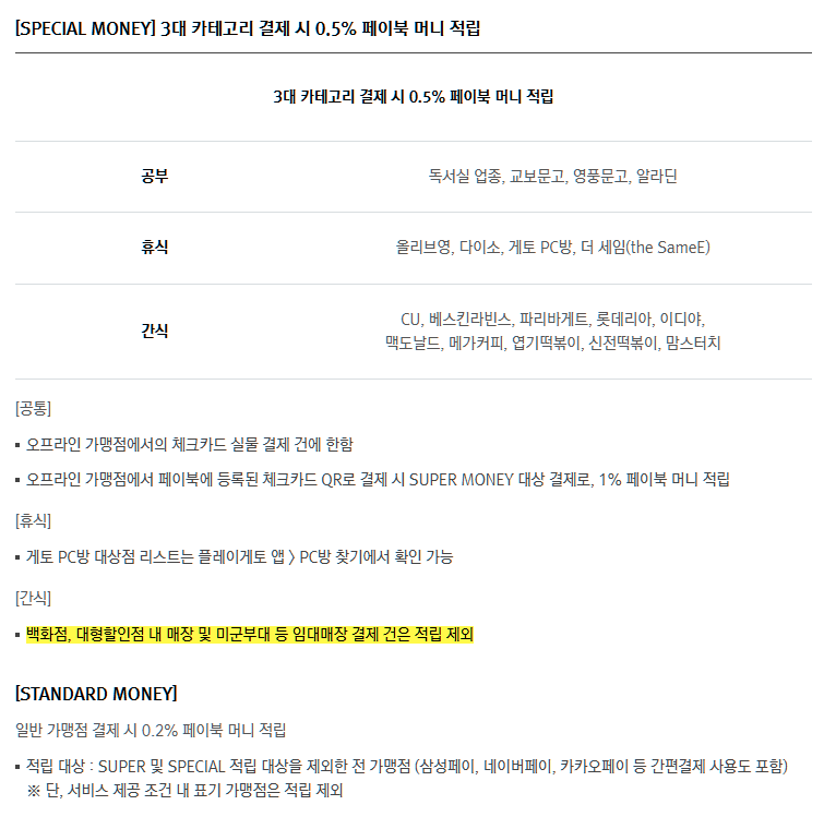 페이북으로 결제하지 않더라고 3대 카테고리에서는 0.5%, 이외 가맹점에서는 0.2% 캐시백이 됩니다
