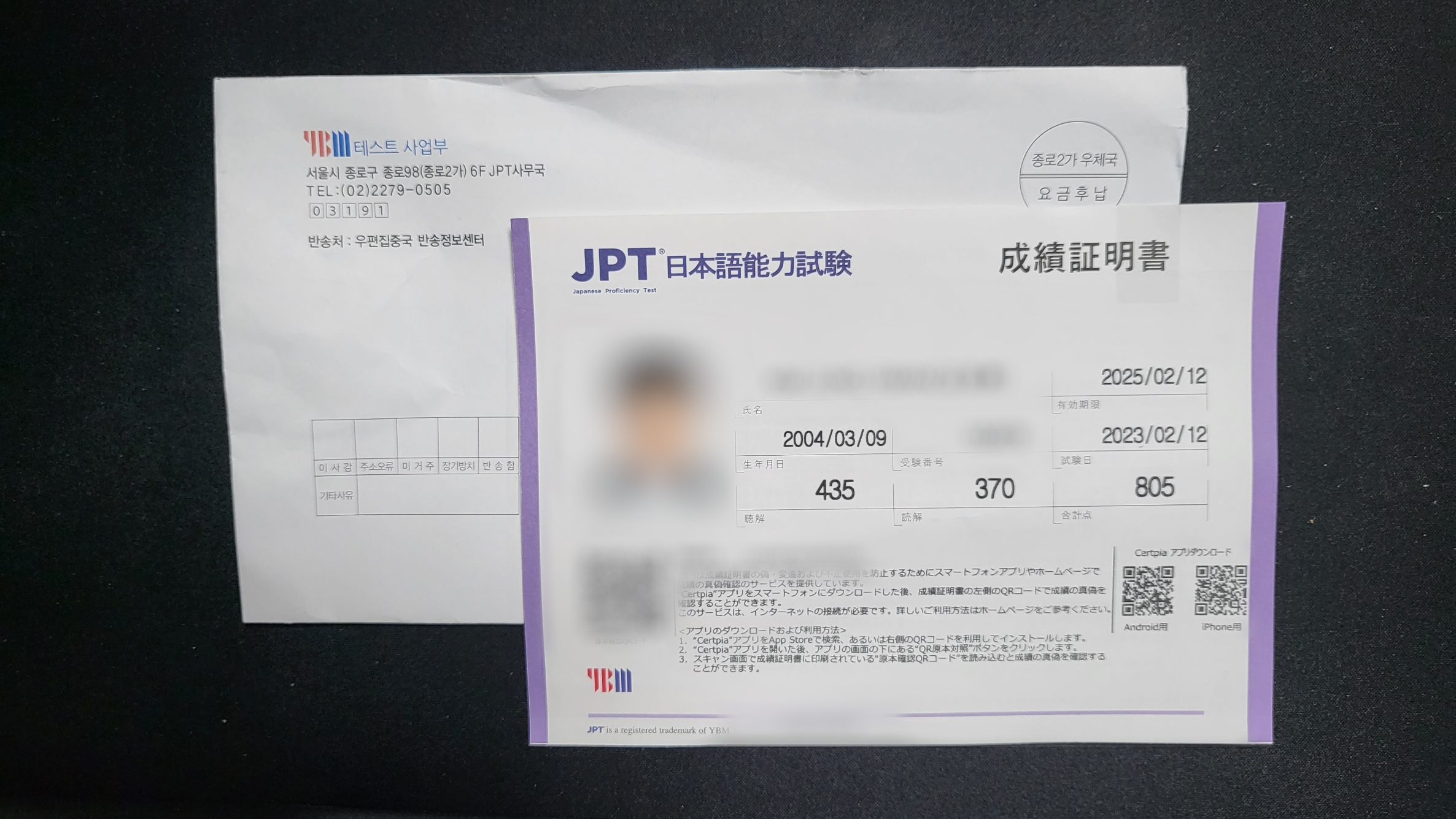 성적표 수령을 우편으로 해뒀었는데 작년에 봤던 JLPT보다도 빨리 오네요