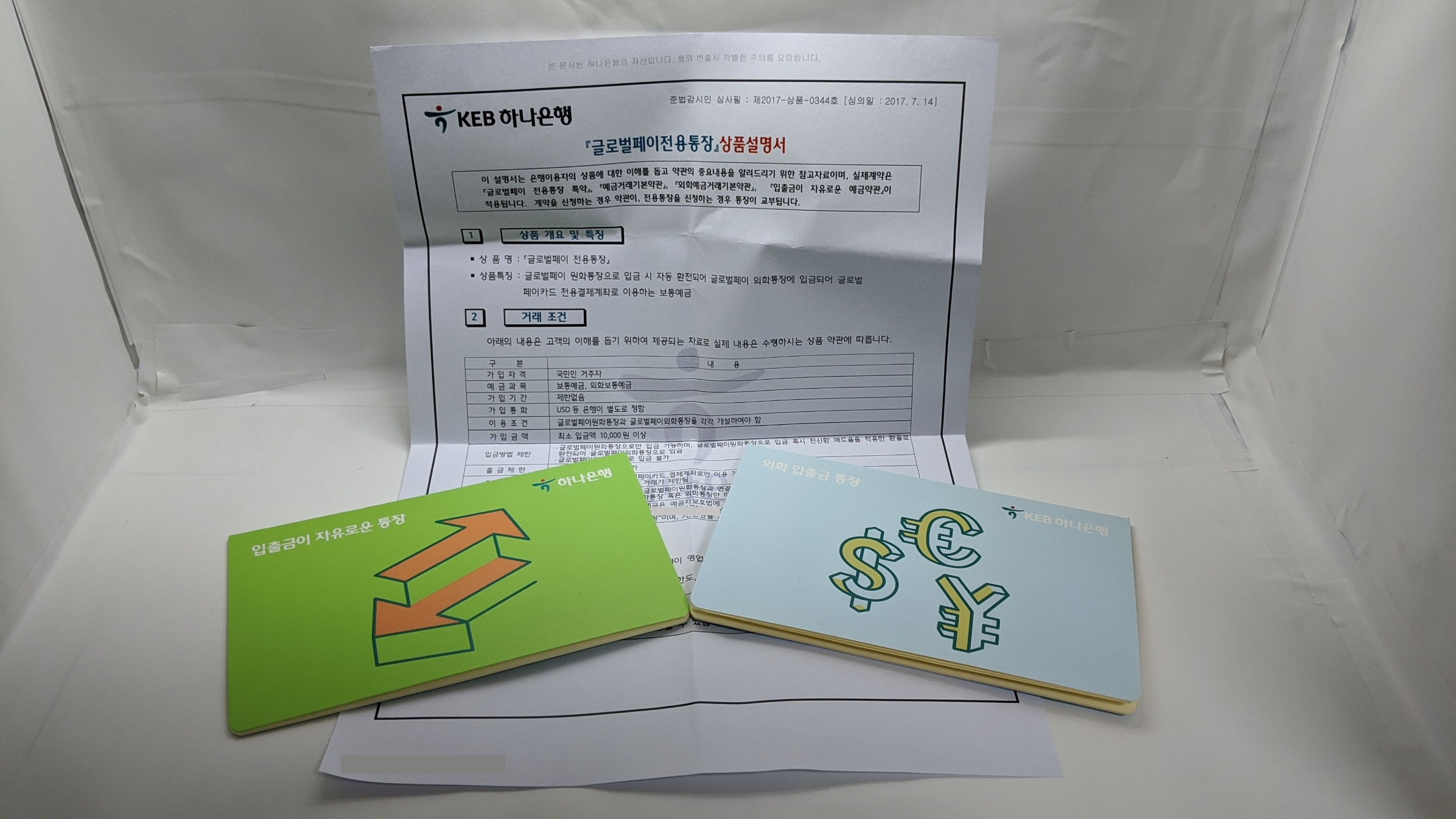글로벌페이 전용통장은 원화통장+외화통장(USD) 두 개를 같이 개설해야 합니다. (해지 시에도 동시에 해지)