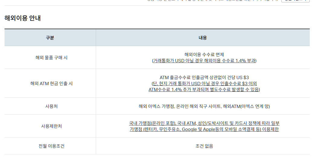 비바 시리즈나 길한통처럼 해외이용 수수료가 면제되는 카드입니다.