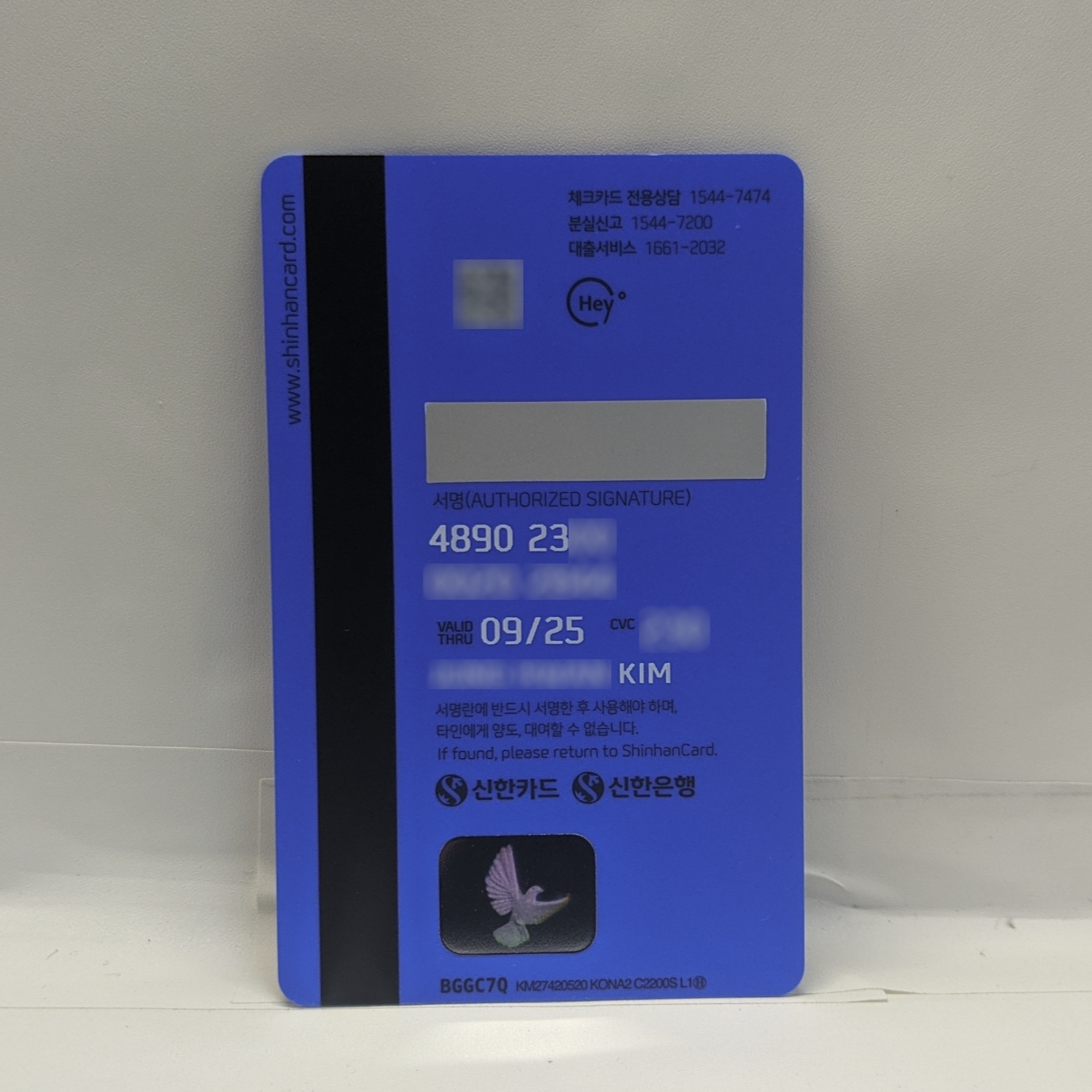 현대카드처럼 앞면에 이름이 없습니다. 뒷면 정보도 세로로 나와있네요.