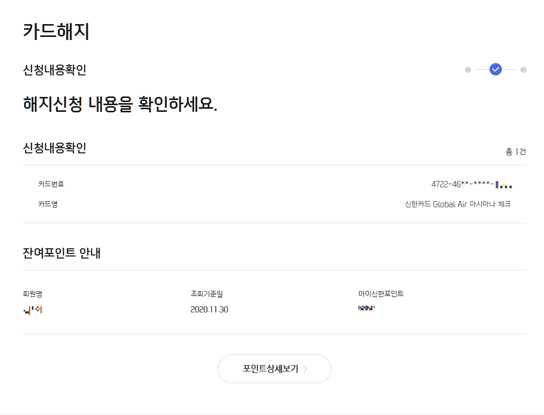 그러면 해지할 카드와 잔여 포인트가 나옵니다.