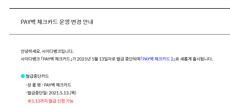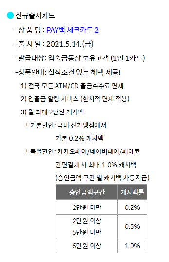 14일 이후로는 혜택이 너프된 PAY백 체크카드 2로만 발급이 가능하게 됩니다.